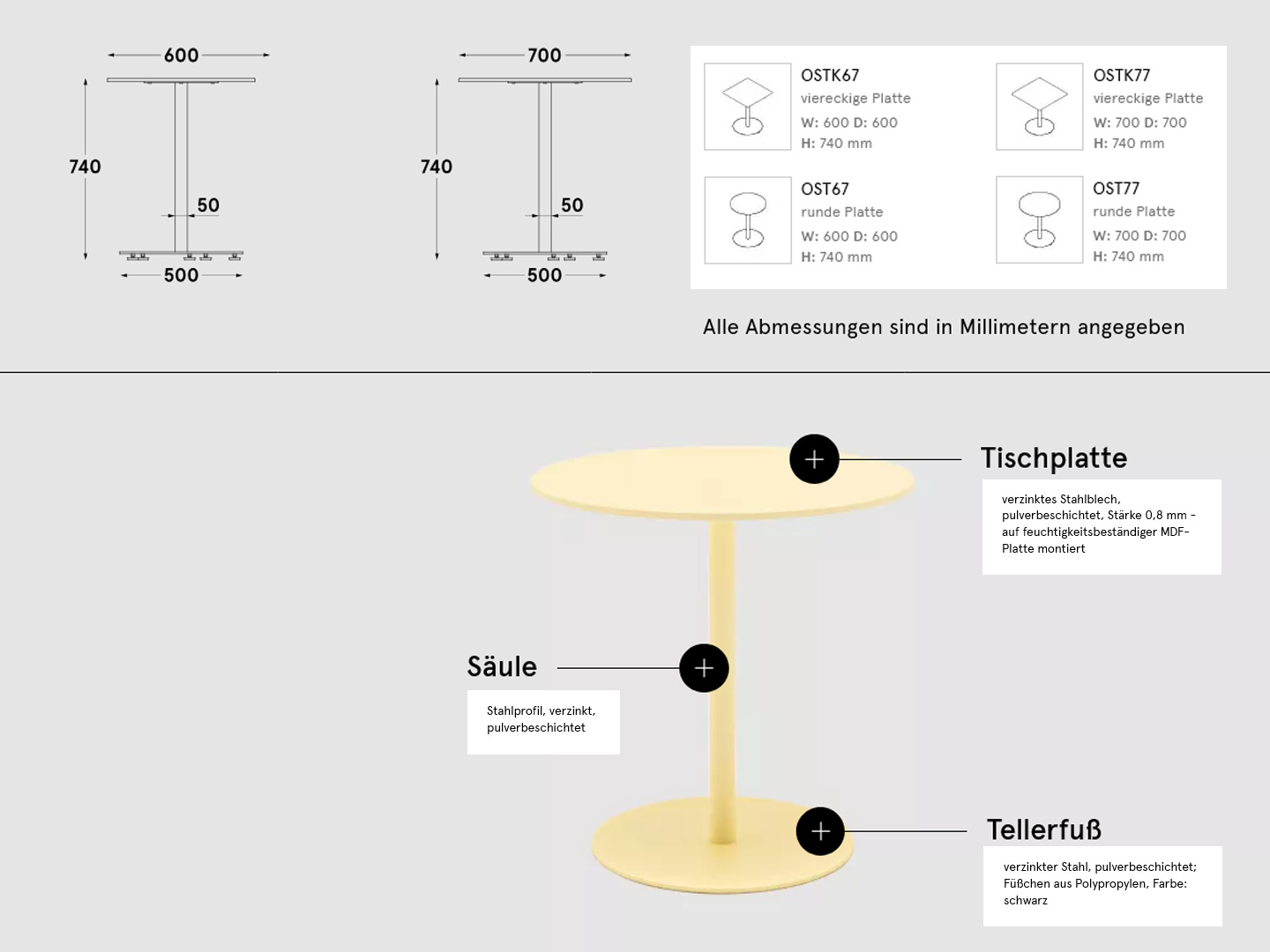 Individuelle Tischplattenwahl – rund oder quadratisch, in verschiedenen Abmessungen erhältlich