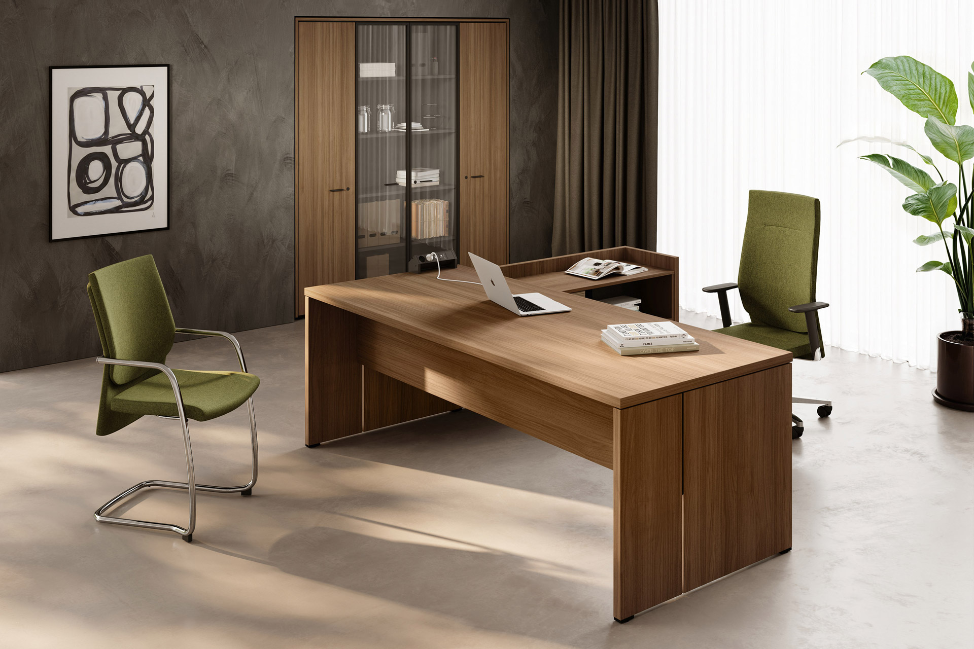 Wählen Sie zwischen Varianten mit oder ohne Winkeltisch-Anbau, um Ihren Arbeitsbereich optimal zu gestalten und Ihre individuellen Bedürfnisse zu erfüllen. Die markanten 35-mm starken Tischplatten treffen aufeinander, ohne sich zu berühren und schaffen so eine einzigartige visuelle Dynamik. Diese raffinierte Konstruktion unterstreicht die feine Handwerkskunst, die in jede unserer Möbelstücke einfließt.
