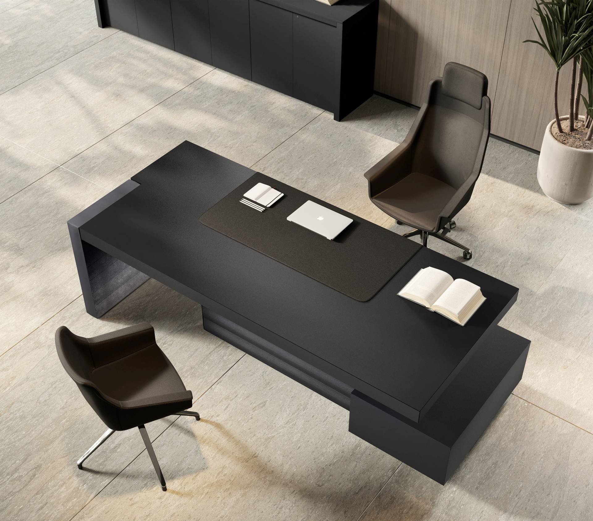 - Oberflächen in verschiedenen Dekor- und Funier-Ausführungen, einfarbige Korpusfarben in Schwarz und Bronze Melamin